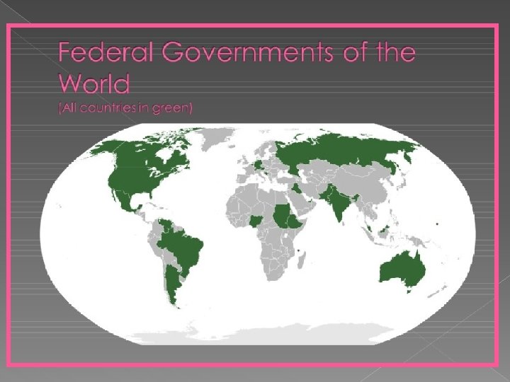 Federal � A system in which power is shared by a powerful central government and the state and local governments. � States or provinces are given considerable self-rule, usually through their own legislature. � Examples › United States › Mexico › Germany