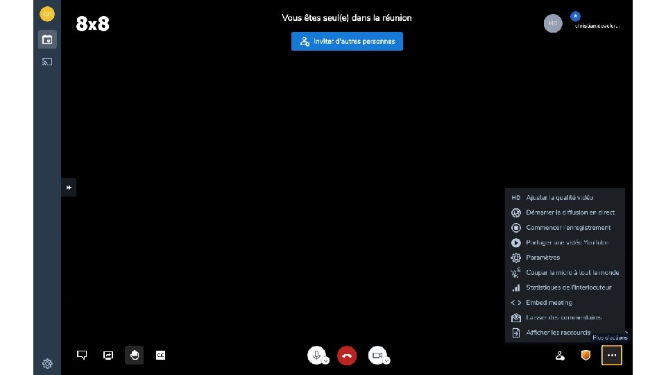 Quitter Ouvrir/fermer le chat Partager l’écran Lever/baisser la main Micro on/off Camera on/off