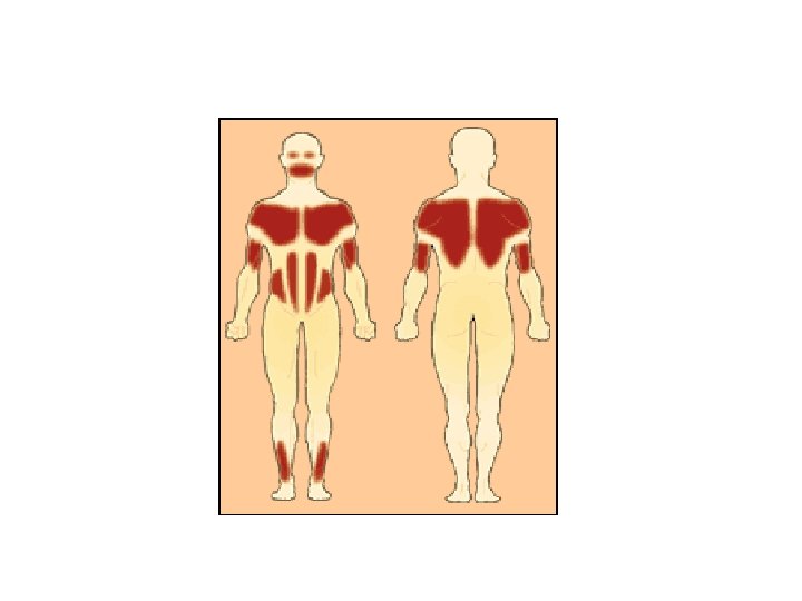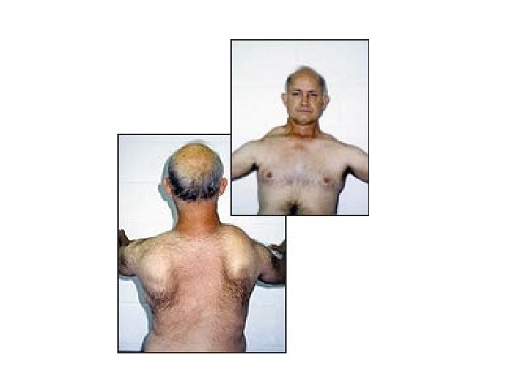 DISTROFIA MUSCULAR FACIOESCAPULOHUMERAL • Por lo general, los primeros indicios de la distrofia muscular facioescapulohumeral son una inclinación de los hombros hacia adelante y dificultad en levantar los brazos por encima de la cabeza y en cerrar los ojos. El avance es lento, con largos periodos de estabilidad alternados con cortos periodos de deterioro muscular rápido y aumento en la debilidad. Aun cuando la enfermedad puede ser muy ligera, a veces puede provocar considerable incapacidad, deteriorando la habilidad para caminar. En su forma más severa, reduce la duración de la vida.