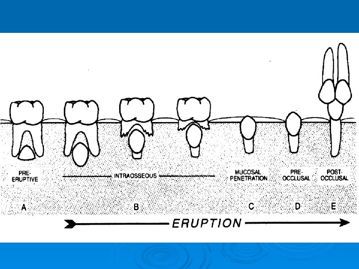 Stages of Tooth Eruption Ø Pre-eruptive Ø Intra-osseous Ø Mucosal penetration Ø Pre-occlusal Ø Post-occlusal