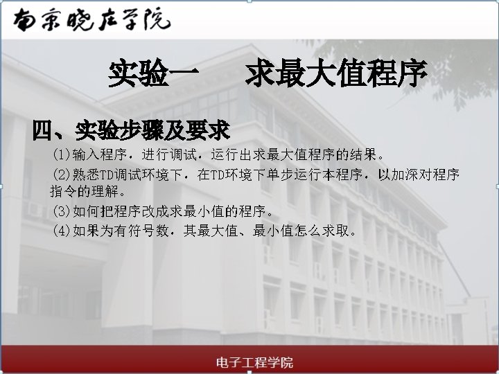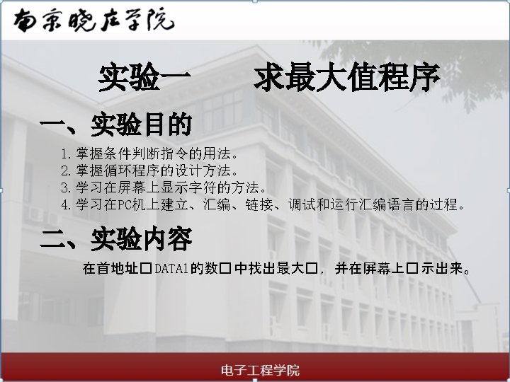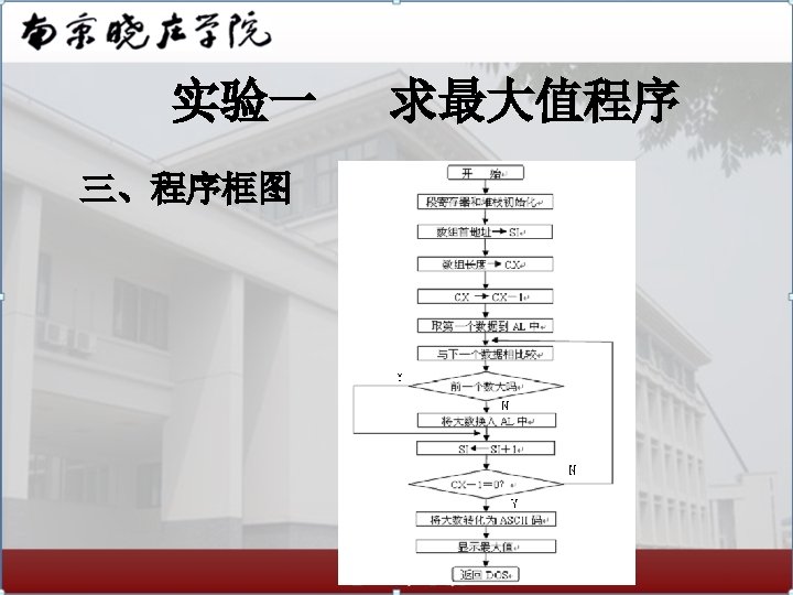 实验一 NEXT: MAX 2: LOOP MOV SHR CMP JA ADD DISX MOV AND CMP JA ADD MAX 1 BL, AL CL, 04 AL, CL AL, 09 MAX 4 AL, 30 H AL AL, BL AL, 0 FH AL, 09 MAX 5 AL, 30 H 求最大值程序 MAX 3: MAX 4: MAX 5: CODE DISX MOV INT ADD JMP ENDS END AL AH, 4 CH 21 H AL, 37 H MAX 2 AL, 37 H MAX 3 START