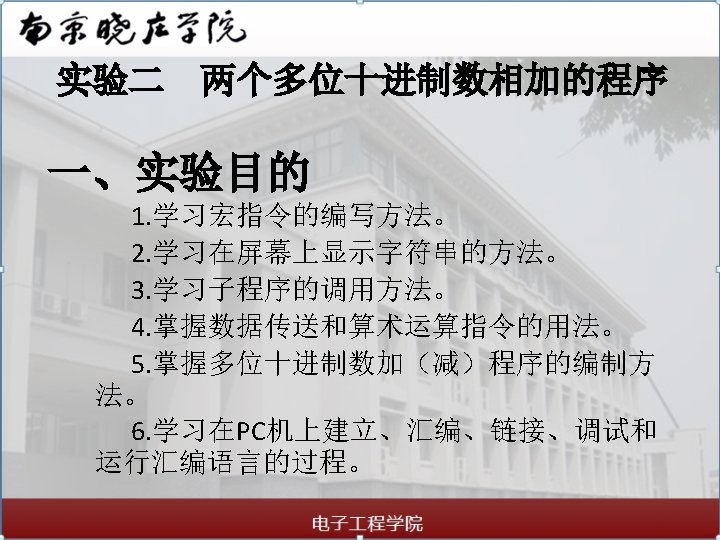 实验二 两个多位十进制数相加的程序 四. 实验程序 DISX DATA MESS DATA 1 DATA 2 DATA 3 DATA STACK STA TOP STACK MACRO X MOV DL, X MOV AH, 02 H INT 21 H ENDM SEGMENT DB 'TWO MULBIT DECIMAL NUMBERS ADD', 0 DH, 0 AH DB 0 DH, 0 AH, '$' DB 33 H, 39 H, 31 H, 37 H, 34 H DB 36 H, 35 H, 30 H, 38 H, 32 H DB 6 DUP(? ) ENDS SEGMENT DB 20 DUP(? ) EQU LENGTH STA ENDS