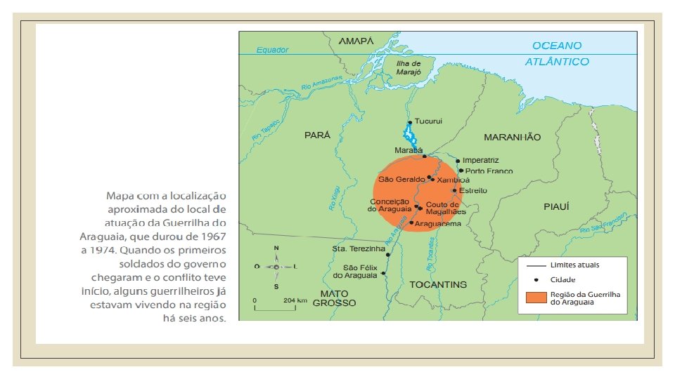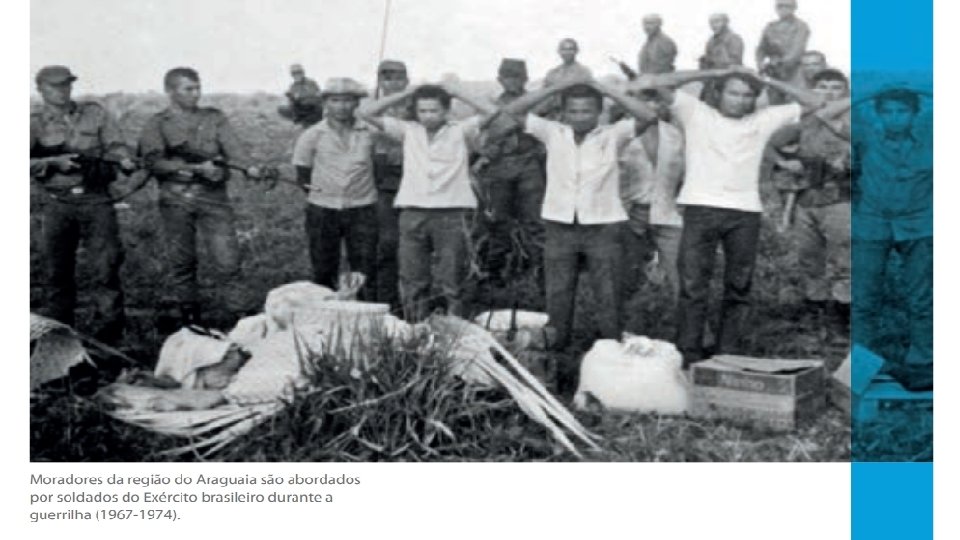 Guerrilha Revolucionária ◦ 1968 - Influenciados pela Guerrilha de Cuba parte da Esquerda começou um combate contra a Ditadura através da luta armada. ◦ Entre as principais: Aliança Libertadora Nacional (ALN), Vanguarda Armada Revolucionaria – Palmares e Comando de Libertação Nacional. ◦ Entre os membros da Guerrilha estava Carlos Marighella. ◦ Entre as ações destes grupos estavam a ida para locais mais afastados centros urbanos como por exemplo a Guerrilha do Araguaia entre 1967 e 1974. ◦ Para manter o movimento faziam roubos, ações terroristas (bombas em locais públicos, sequestros de embaixadores), executavam suspeitos de traição. ◦ O governo para conter os opositores torturava e espionava a