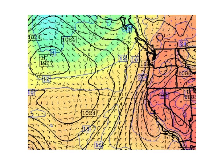 Sea Breeze Winds Along the Southern Oregon Coast • Gusts frequently reach 30 -35 knots during the summer during the afternoon. • Very painful to stay on the beach! • Strong pressure gradient normal to the coast between the warm land areas and the cold upwelling water.