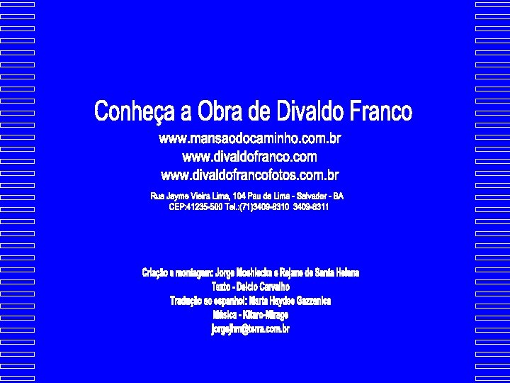 Divaldo Franco magnetiza platéias quando faz desfilar palavras que anunciam a Boa Nova de Jesus, clarificadas pelas luzes da 3ª Revelação. É um autêntico arauto de mensagens iluminativas, deixando marcas indeléveis pela sua oratória candente e bela, que conforta e anima, despertando consciências para a grandeza da vida. Divaldo Franco magnetiza a las plateas cuando pronuncia la palabras que anuncian la Buena Nueva de Jesús, explicadas por las enseñanzas de la 3ª Revelación. Es un auténtico pregonero de los mensajes iluminadores, y deja señales indelebles con su oratoria candente y hermosa, que conforta y reanima, despertando a las conciencias hacia la trascendencia de la vida.