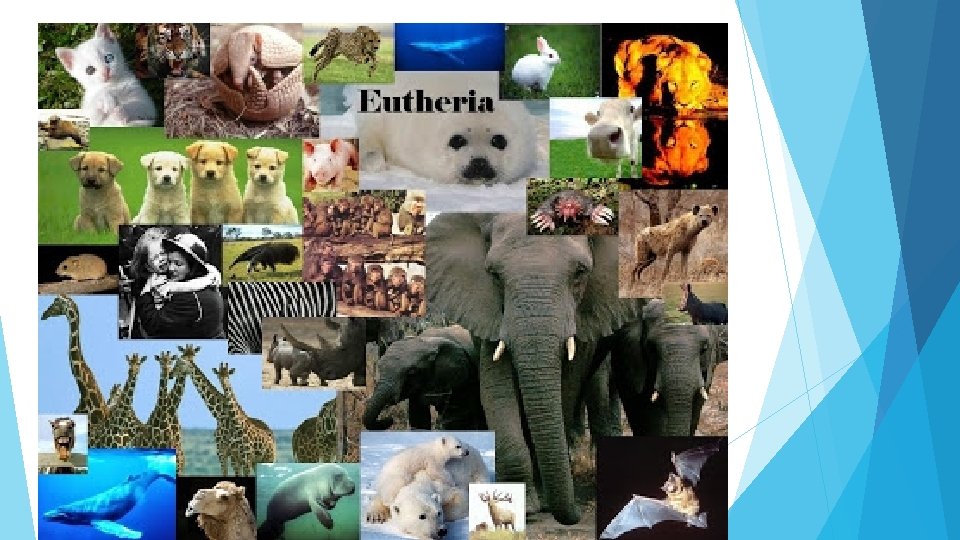 Eutheria Neste grupo estão os mamíferos vivíparos, que passam por um longo período de gestação. Nascendo completamente formados. Os eutérios ou mamíferos placentários a placenta é bem desenvolvida. Nos metatérios, a placenta é reduzida ou ausente.