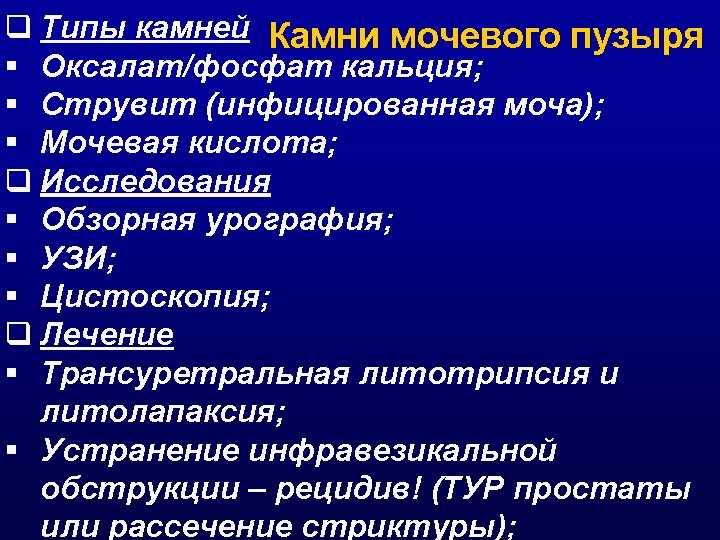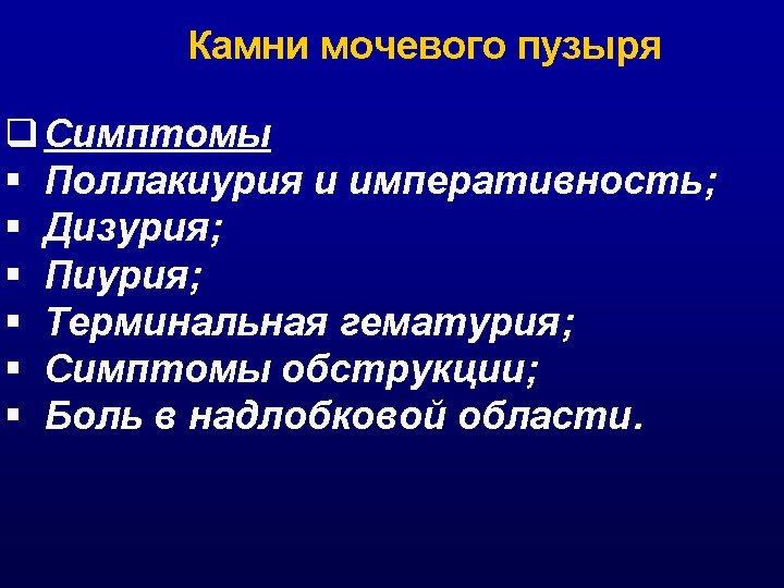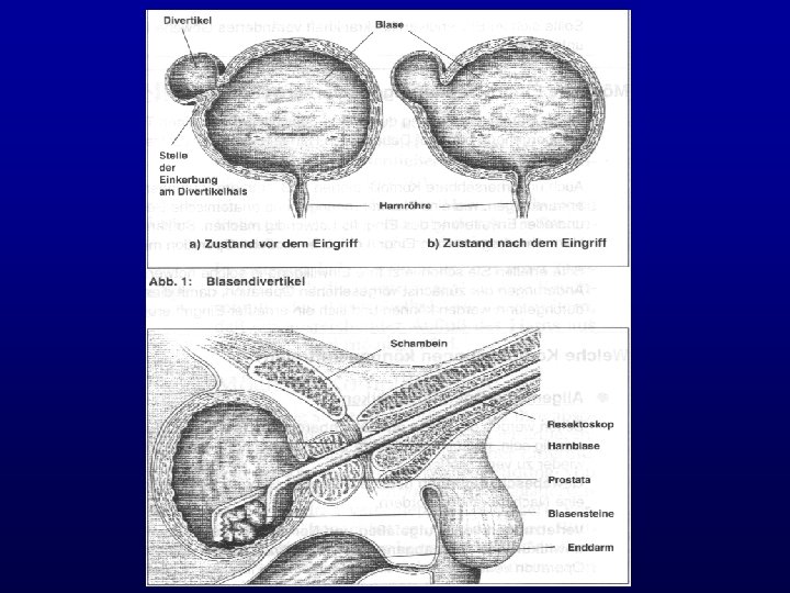 DIVERTICULA OF THE BLADDER Acquired Diverticula (a) Pulsion Diverticula. Clinical Picture: By an uninfected diverticulum there are no symptoms and no pathognomonic symptoms: - Symptoms of the cause: BNO, BPH; - Symptoms of complications: frequency, pyuria - Micturation symptoms: “Double micturation” - in a few cases micturation occurs twice, the 1 st specimen is clear & the 2 nd is cloudy.