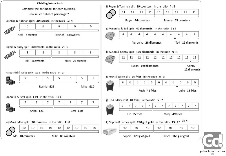 Dividing into a Ratio f) Roger & Tammy split 99 counters in the ratio 4 : 5 Complete the bar model for each question. How much did each person get? a) Andi & Hannah split 30 sweets in the ratio 1 : 4 6 6 Andi 6 sweets 6 6 6 g) Veronika & Ted split 40 diamonds in the ratio 7 : 3 Hannah 24 sweets b) Bill & Katty split 40 sweets in the ratio 2 : 3 h) Susan & Conny split 120 diamonds in the ratio 9 : 1 Bill 16 sweets Katty 24 sweets c) Rashid & Mike split £ 35 in the ratio 5 : 2 i) Rosh & Julie split 66 fries in the ratio 8 : 3 d) Anita & Bert split £ 49 in the ratio 3 : 4 e) Mo & Mike split 90 counters in the ratio 1 : 8 j) Liz & Mary split 84 fries in the ratio 5 : 7 k) Sophie & James split 280 g of gold in the ratio 15 : 20