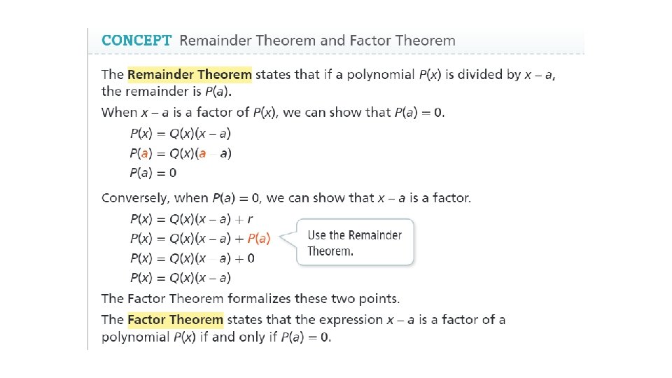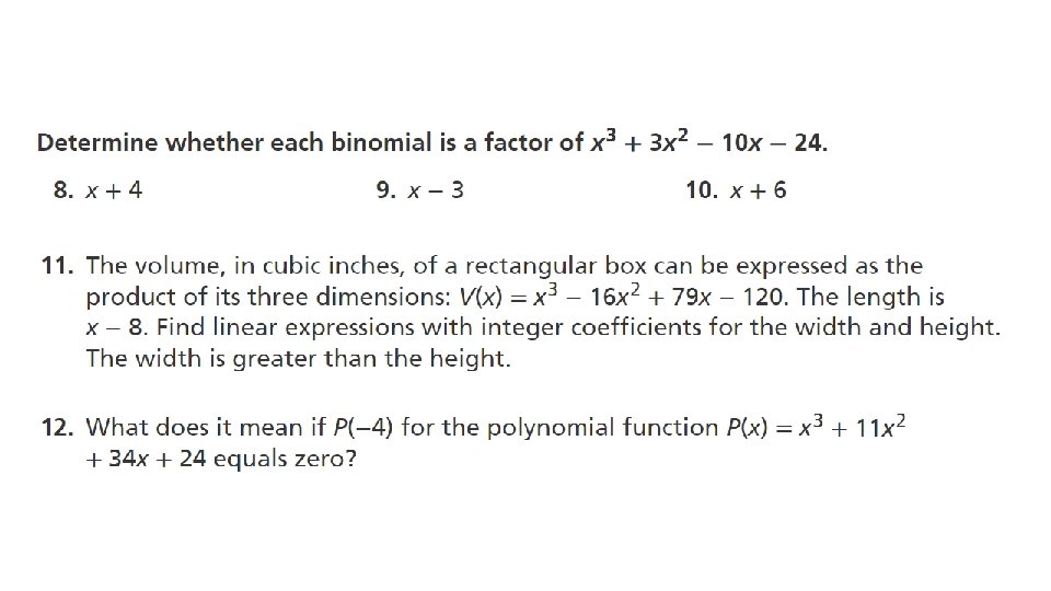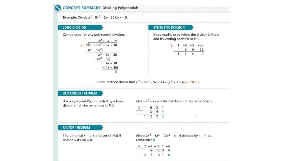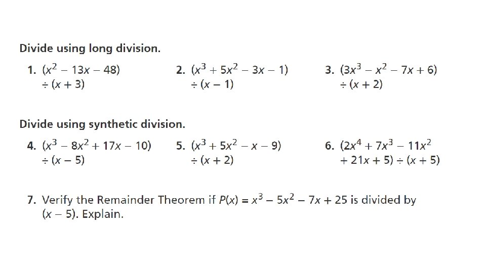 Synthetic Division Use synthetic division to find (x 3 – 4 x 2 + 6 x – 4) ÷ (x – 2). Step 1 Write the terms of the x 3 – 4 x 2 + 6 x – 4 dividend so that the degrees of the terms are in – 6 descending order. Then write 1 – 4 4 just the coefficients as shown. Step 2 Write the constant r of 1 – 4 6 the divisor x – r to the – 4 left. In this case, r = 2. 1 Bring the first coefficient, 1, down as shown.