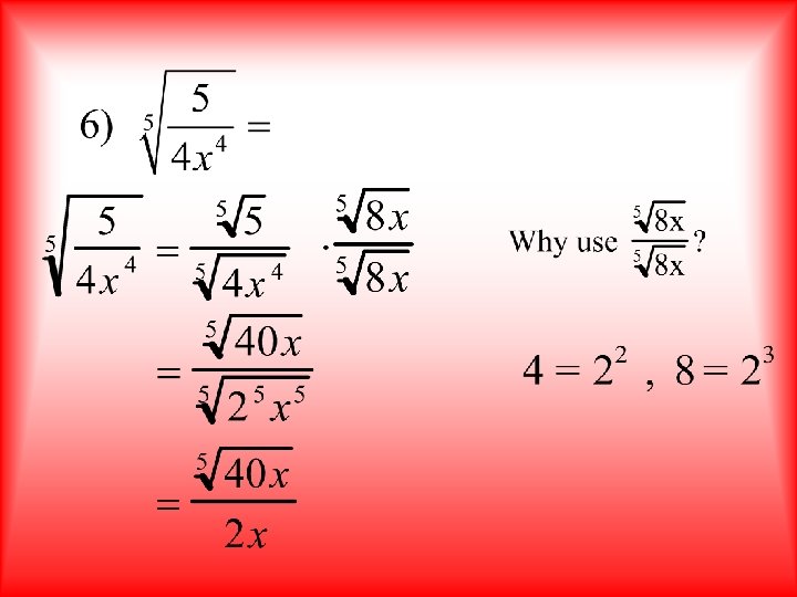 Simplify each expression. This time, to rationalize the denominator you should factor the 4. How many more factors of what number will you need? Answer
