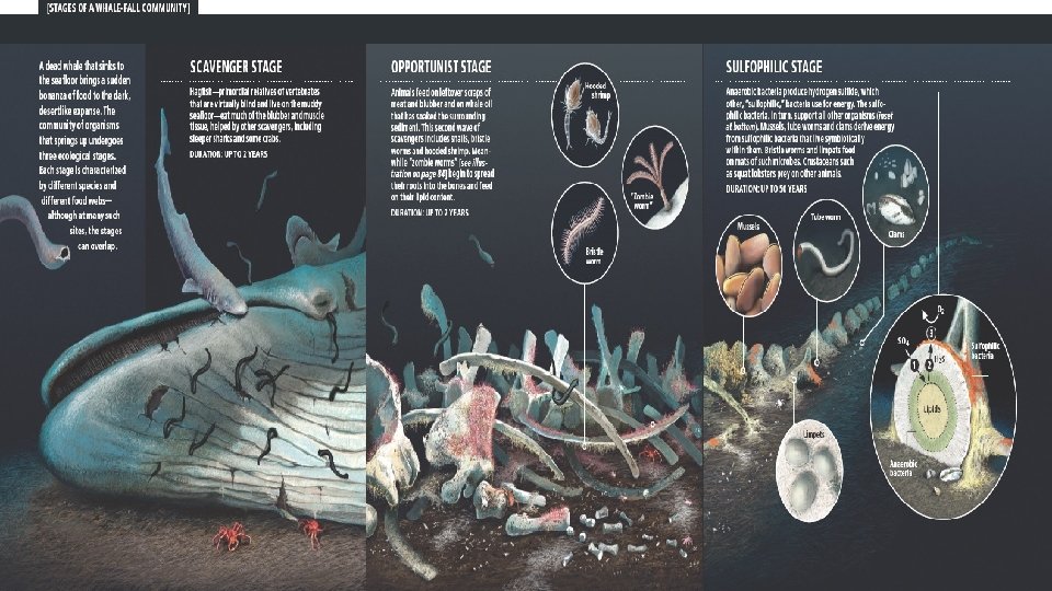LET’S ANALYZE DATA • Page 11 -12 • he varied species that break down the whale exist at all depths. • The specific species that arrive and perform the decomposition of the whale carcasses are different depending on the depth of the whale fall. • The time it takes for each stage can vary widely.