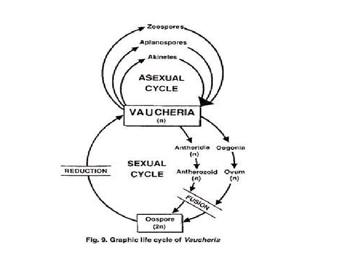 antheridium oogonium Vaucheria genus of yellow-green algae characterized by multinucleate tubular branches lacking cross walls (called Coenocyte ) except in association with reproductive organs or an injury. Food is stored as oil globules. Asexual reproduction is by motile multiflagellate zoospores and nonmotile aplanospores.