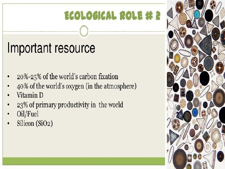 Characteristic Symmetry Centric aiatoms Radial Pennate diatoms Bilateral Example Cyclotella, Stephanodiscus Navicula, Pinnularia Gliding motility Non-motile Some diatoms are motile Plastids Many discoid Two large plate-like plastids Egg cells Oogamous-production of one or two eggs per parent cell Isogamous Sperm cells 4 -128 sperm per parent cell. Each with a single flagellum bearing two rows of mastigoneme Few amoeboid, non –flagellate sperm cells Ecology Mainly planktonic , typical of Planktonic , epiphytic and benthic forms