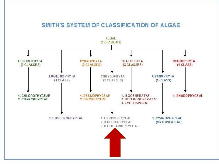 Division: Chrysophyta 1 -Class: Chrysophyceae(golden algae) 2 -Class: Xanthophyceae(yellow-green algae) 3 -Class: Bacillariophyceae (Diatoms)