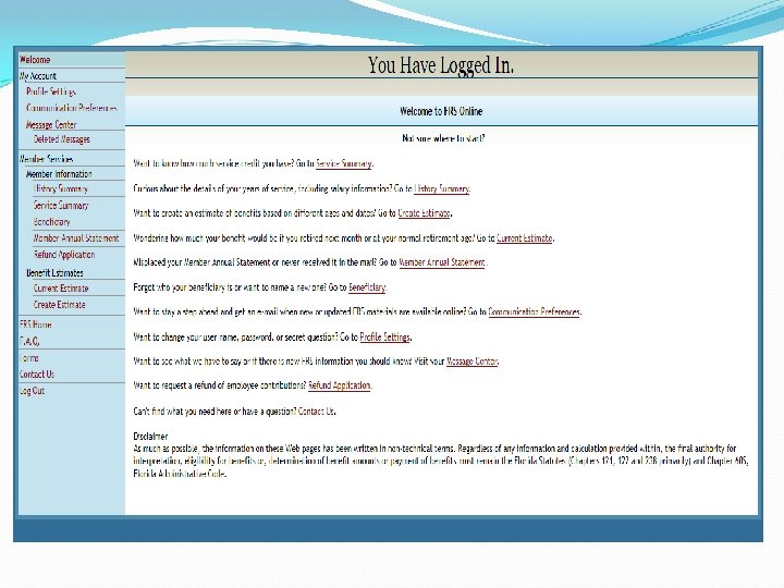 The Retiree Packet Ø A retiree packet is mailed to new retirees just prior to receipt of their first benefit check. Ø Retiree Packet Ø Form W-4 P, Withholding Certificate for Pension Payments Ø Form DFS-A 1 -26 R, Direct Deposit Authorization Ø Form HIS-1, FRS Pension Plan Health Insurance Subsidy Certification