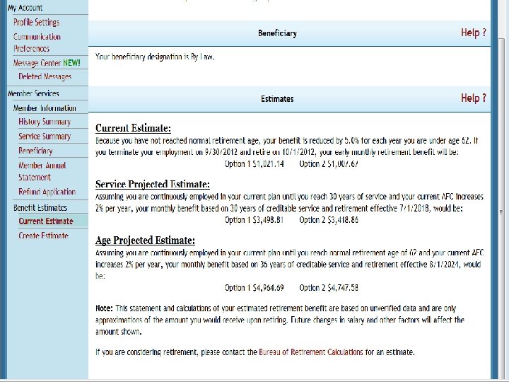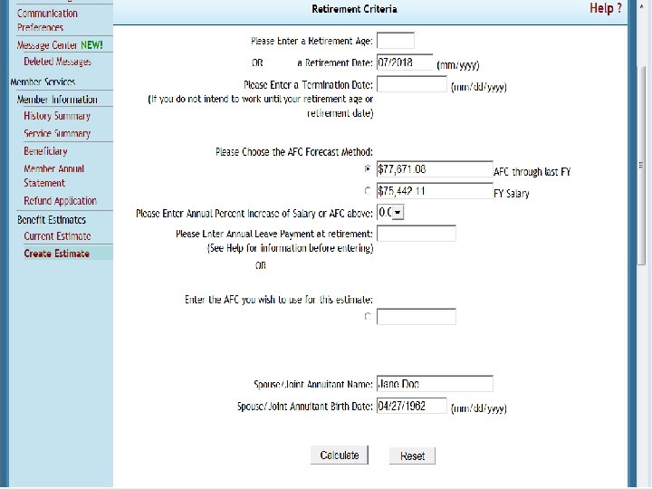 Benefit Calculation Formula (Normal Retirement Example – Regular Class) Years of Service x Value Per Year x AFC 30. 00 x 1. 60% x $40, 000. 00 = $19, 200. 00 Option 1 Annual Benefit Divided by 12 = $1, 600. 00 Monthly Option 1 Benefit