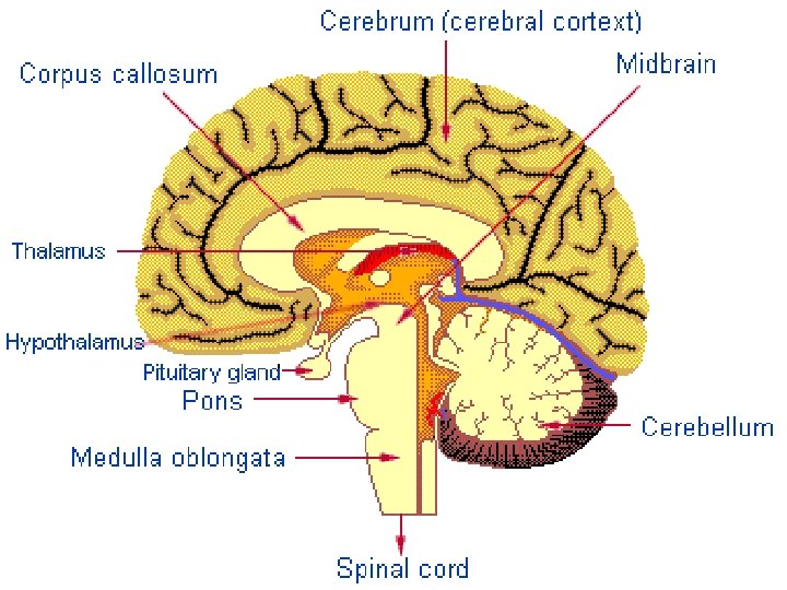Cerebrum -Largest part of the brain -Controls: Conscious thought Perceives sensory information Initiates movements -Contains 2 hemispheres (Right and left) -Memory