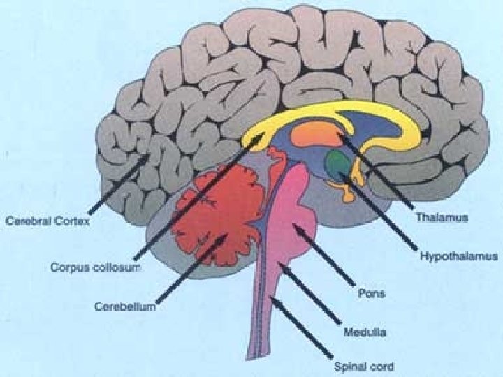 The Brain n The brain helps relay messages, process and analyze information n Made up of 4 main parts § The Cerebrum § The Cerebellum § The Brain Stem § The Thalamus and Hypothalamus