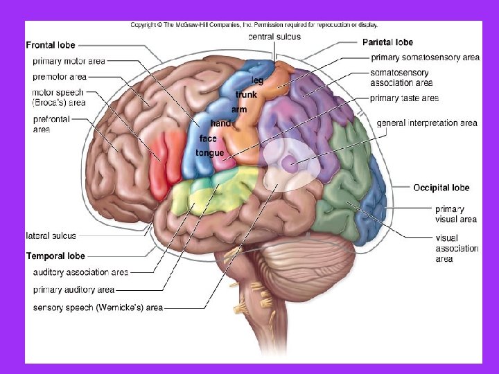 c. Brain Stem • Attaches brain to spinal cord • Parts of the brain stem – Midbrain – vision, hearing, motor control – Pons – breathing, sleep – Medulla oblongata involuntary activities (breathing, heart rate, blood pressure)