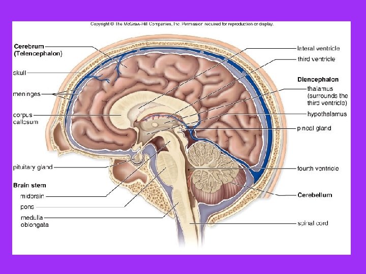 • DISEASE: Meningitis – Inflammation of the meninges – Can be caused by an viral , bacterial or microorganism infection – Causes headaches, neck stiffness, confusion, sensitivity to light and sound – Can be life threatening • DISEASE: Hydrocephalus (“water on the brain”) – Accumulation of CSF in the brain – Exerts pressure on the brain causing brain damage