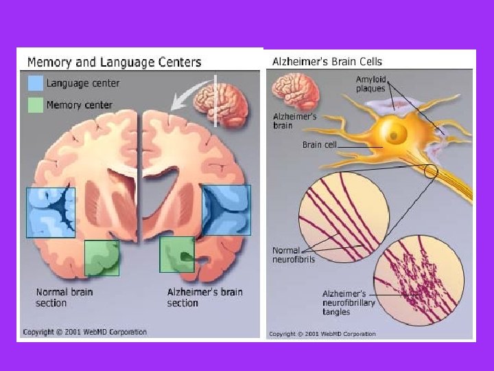 Alzheimer’s Disease • Progressive degenerative brain disease • Mostly seen in the elderly, but may begin in middle age • Structural changes in the brain include abnormal protein deposits and twisted fibers within neurons • Victims experience memory loss, irritability, confusion and ultimately, hallucinations and death