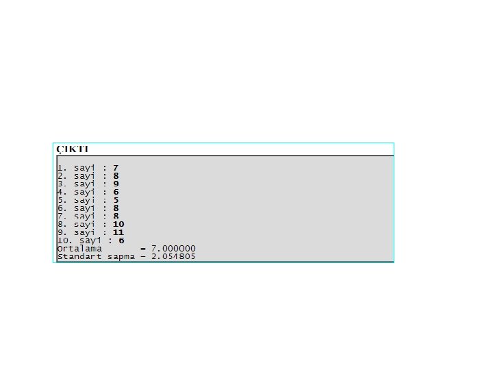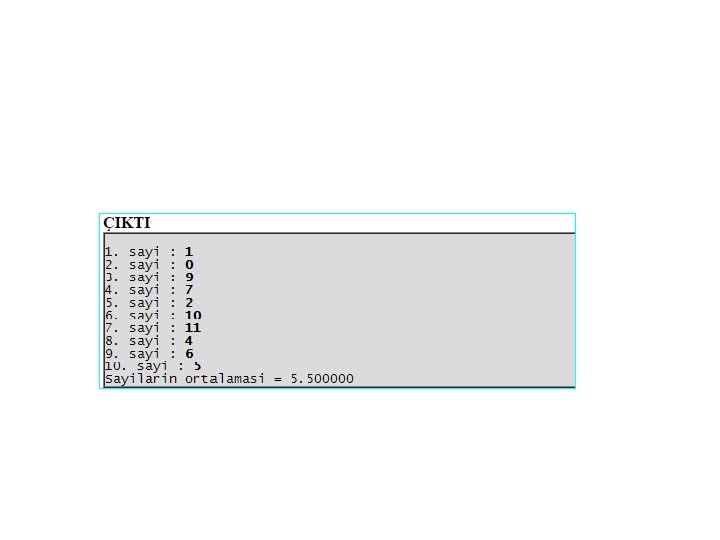 • Klavyeden girilen N = 10 adet sayının ortalamasını hesaplar. Ortalama formülü ile hesaplanabilir.