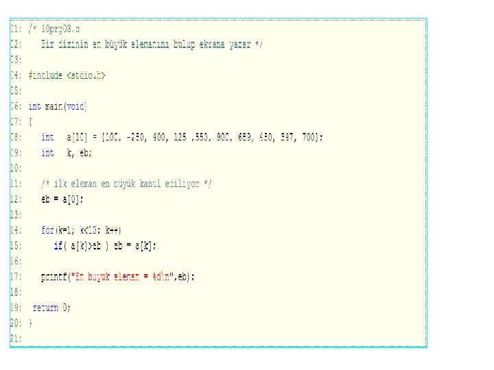• En büyük sayıyı bulan bu algoritma oldukça kolaydır. 12. satırda eb = a[0]; ataması ile dizinin ilk elemanının en büyük olduğu varsayılır. Daha sonra büyüğe rastladıkça (15. satır) eb = a[k]; ile eb değişmektedir. • Program 10. 3 bir dizinin en büyük elemanını bulur. En büyük elemanın kaçıncı indis (eleman) olduğu sorgulanmak istendiğinde: programdaki koşul yapısını aşağıdaki gibi değiştirmek yeterlidir. eb değiştikçe, i değişkeni en büyük elemanın indisini tutar.