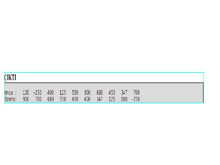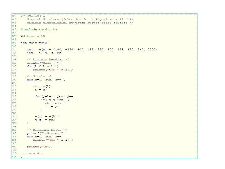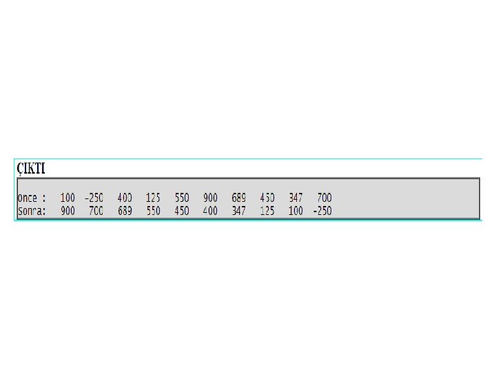• • • for(k=0; k<10; k++){ if( a[k] > eb ) { eb = a[k]; i = k; } } n elemanlı bir dizinin, elemanlarını büyükten küçüğe doğru sıralamak için çok popüler iki algoritma aşağıda verilmiştir