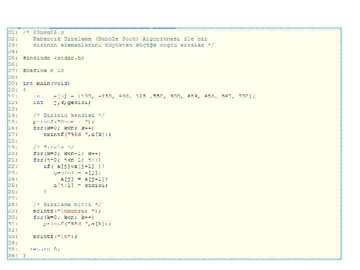 Kabarcık Sıralama (Bubble Sort): • Yanyana elemanları karşılaştırarak yer değiştir biçimde sıralamadır. Algoritmanın uygulaması Program 10. 5'de gösterilmiştir. Bu algoritmanın karmaşıklığı: (n-1)2 dir
