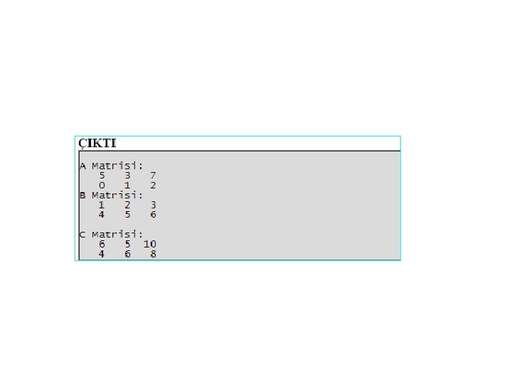 int x[3][4] = {11, 34, 42, 60, 72, 99, 10, 50, 80, 66, 21, 38}; yada int x[3][4] = {11, 34, 42, 60, /* 1. satır elemanları */ 72, 99, 10, 50, /* 2. satır elemanları */ 80, 66, 21, 38}; /* 3. satır elemanları */ Bu matris ekrana matris formunda yazılmak istendiğinde: for(i=0; i<3; i++) { for(j=0; j<4; j++) printf("%4 d", x[i][j]); printf("n"); }