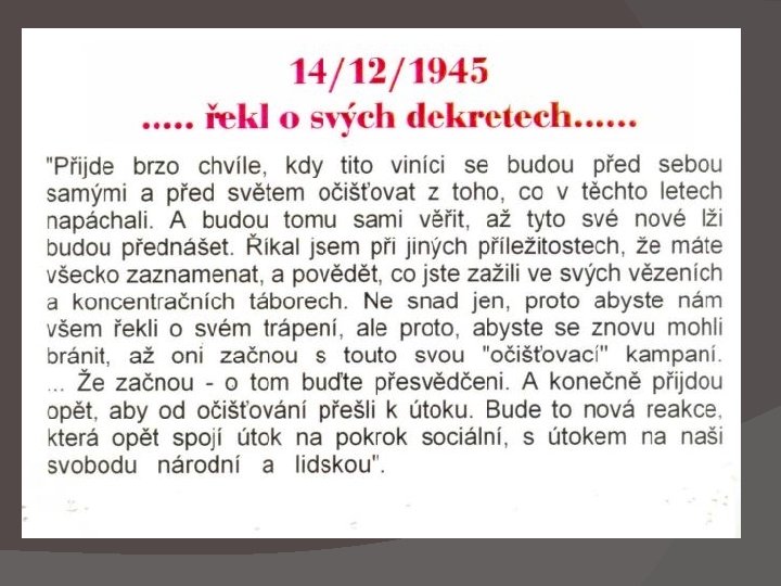 Oficiálně „Dekrety prezidenta republiky“ Právní předpisy vydávané prozatímním státním zřízení a později prezidentem republiky s mocí zákona Podle ústavního dekretu o prozatímním výkonu moci zákonodárné vydávala vláda dekrety na místě Národního shromáždění, vzhledem k tomu, že nebylo možno vykonávat zákonodárnou moc v souladu s Ústavou Vedle dekretů o znárodnění většiny průmyslových podniků, pojišťoven, bank, zavedení centrálního plánování, všeobecné pracovní povinnosti mezi ně patří i velmi kontroverzní dekrety spojené především s konfiskací majetku etnických Němců a Maďarů, zrušení československého státního občanství etnický Němcům a Maďarům, zrušení německé university, německých vysokých škol technických Všechny dekrety byly po válce 5. března 1946 prohlášeny za zákon Prozatímním Národním shromážděním ústavním zákonem č. 57/1946 Sb. 56 dekretů bylo později zrušeno