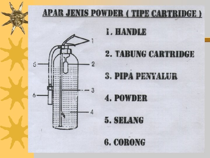 APAR ISI POWDER ADALAH TABUNG APAR YANG DI ISI POWDER KEMUDIAN DITEKAN N 2 ATAU CARTRIDGE 1. Powder kimia REGULER adalah tepung kimia yang efektif untuk memadamkan kebakaran kelas B dan C. 2. Powder kimia MULTI PURPHOSE adalah tepung kimia yang efektif untuk memadamkan kebakaran kelas A, B dan C. 3. Powder kimia SPECIAL DRY POWDER adalah tepung kimia yang efektif untuk memadamkan kebakaran khusus kelas D.