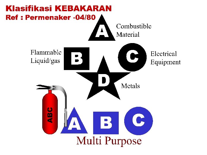 KELASIFIKASI KEBAKARAN ¬ KELAS Kebakaran yang terjadi A pada benda padat kecuali logam (kayu, kertas. karet, kain dll) ¬ KELAS B Kebakaran yang terjadi pada benda cair dan gas (bensin, solar, minyak tanah, LPG, LNG dll) ¬ KELAS C Kebakaran yang terjadi pada peralatan listrik yang masih bertegangan. ¬ KELAS D Kebakaran yang terjadi pada logam (magnesium, zurkunium, titanium dll)