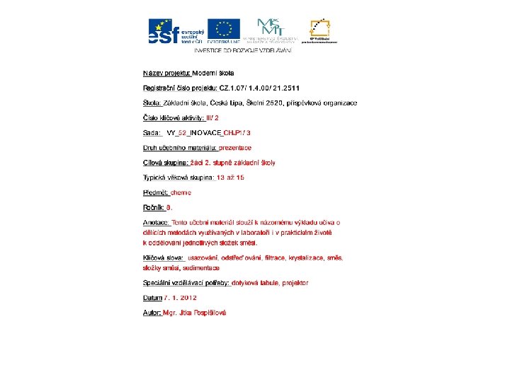 Použité obrázky: • • • Google/ped. muni. cz (filtrační aparatura) Google/bgml. chytrak. cz (destilační aparatura) http: //www. dyson. cz/shop/index. php? a=cylinder (vysavač Dyson) http: //www. zbozi. cz/vyrobek/hotpoint-ariston-armxxf 149/ (automatická pračka) http: //conovehonakopci. cz/? p=3345 (odstředivka na mléko) http: //www. google. cz/imgres? imgurl=http: //katalog. bdlcee. com/editor/image/eshop_products/9203486_l. jpg&imgrefurl=http: //katal og. bdl-cee. com/nalevka-delici-sklenena-kuzelovita-s-ptfe-kohoutem-duran 500 -ml (dělící nálevka) • http: //pixabay. com/cs/d%C 4%9 Bl%C 3%ADc%C 3%AD-n%C 3%A 1 levkyv%C 3%BDpis-t%C 4%9 B%C 5%BEba-chemie-164/ (dělící nálevka s kapalinou) • • • http: //www. gold. com/panninginstructions. htm (rýžování zlata) http: //www. gold. com/panninginstructions. htm (narýžované zlato) Autorem učebního materiálu a všech jeho částí, není-li uvedeno jinak, je Mgr. Jitka Pospíšilová.