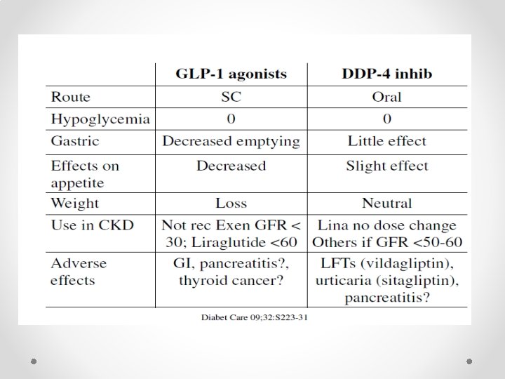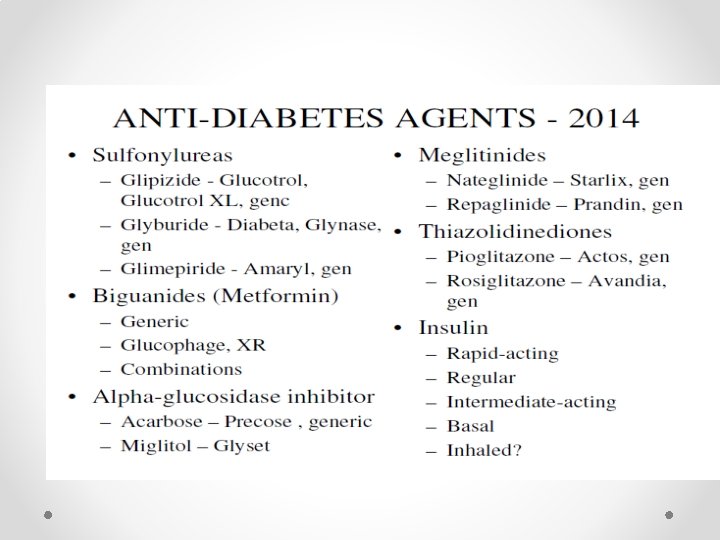MEGLITINIDES • • • Repaglinide (Prandin), Nateglinide (Starlix) • Reduce A 1 c 0. 5 -1. 5 • Advantages – Rapid onset and duration of insulin release – ¯ PPG • Dose with meals – no meal then no dose – Safer than some SUs with CKD • e. GFR < 30 start Repaglinide 0. 5 mg or Nateglinide 60 mg • Disadvantages – Hypoglycemia, weight gain – Frequent dosing with meals – Higher cost than SUs, > $100/month