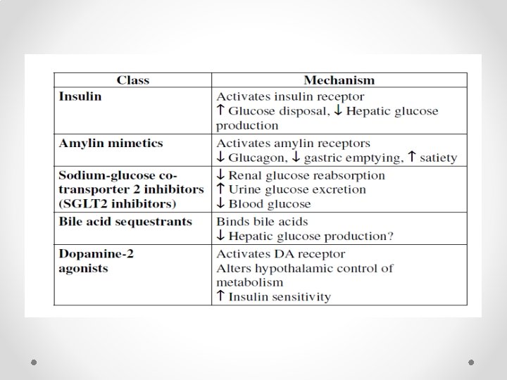 AMYLIN MIMETICS • Pramlintide (Symlin) • Reduce A 1 c by 0. 5 -1 • Advantages – Weight loss – No hypoglycemia with monotherapy – Decrease PPG • Disadvantages – SC injection – GI SIDE EFFECT – 3 xd dosing – Hypoglycemia with insulin FDA warning – Not recommended GFR < 30 – High cost
