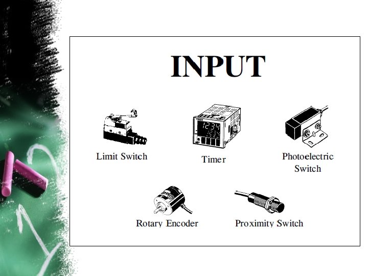 Input Devices • Intelligence of an automated system is greatly depending on the ability of a PLC to read in the signal from various types of automatic sensing and manual input field devices. • Push buttons, keypad and toggle switches, which form the basic man-machine interface, are manual input device. • On the other hand, for detection of work piece, monitoring of moving mechanism, checking on pressure and or liquid level and many others, the PLC will have to tap the signal from the specific automatic sensing devices like proximity switch, limit switch, photoelectric sensor, level sensor, etc. . • Types of input signal to the PLC would be of ON/OFF logic or analogue. These input signals are interfaced to PLC through various types of PLC input module.