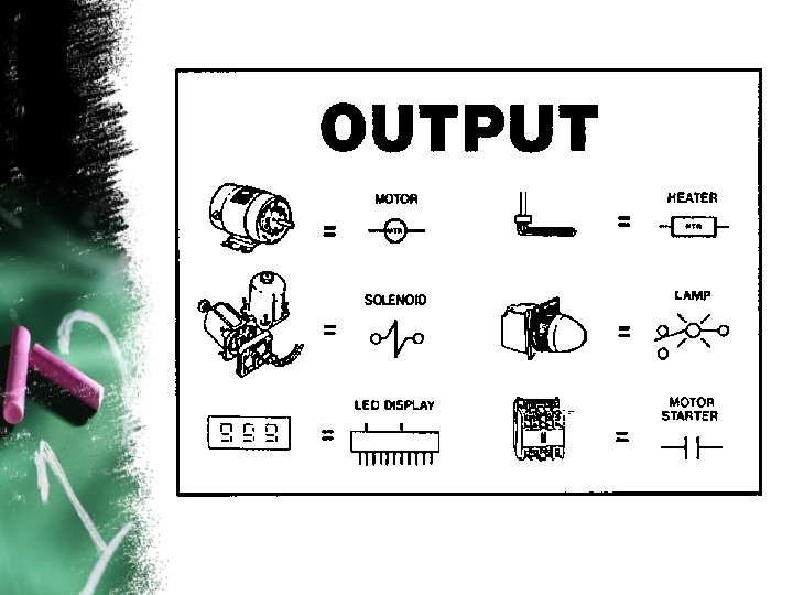 Output Devices • An automatic system is incomplete and the PLC system is virtually paralyzed without means of interface to the field output devices. • Most commonly controlled devices are motors, solenoids, relays indicators, buzzers and etc. • Through activation of motors and solenoids the PLC can control from a simple pick and place system to a much complex servo positioning system. • These type of output devices are the mechanism of an automated system and so its direct effect on the system performance.