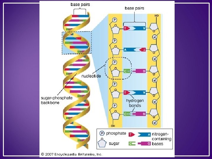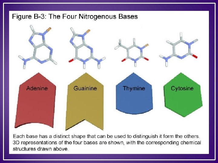 Nitrogen bases in DNA • DNA has four different nitrogen bases (two purines and two pyrimidines). • The nitrogen bases are: • A is for Adenine • G is for Guanine • C is for Cytosine • T is for Thymine Adenine and Guanine are purines. Cytosine and Thymine are pyrimidines.