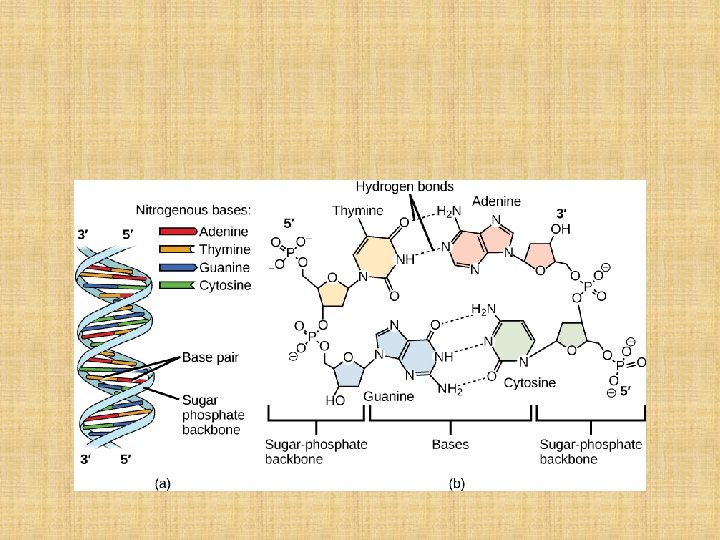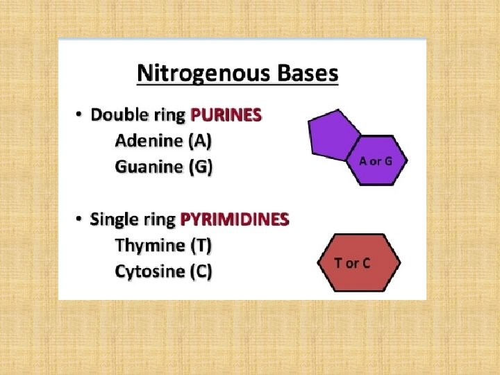 Four Nitrogenous Bases • Adenine (A) • Guanine (G) • Cytosine (C) • Thymine (T) • Chargaff’s Rule: Organisms should have 1: 1 ratio purines and pyrimidines(base pair rule) A=T and G=C