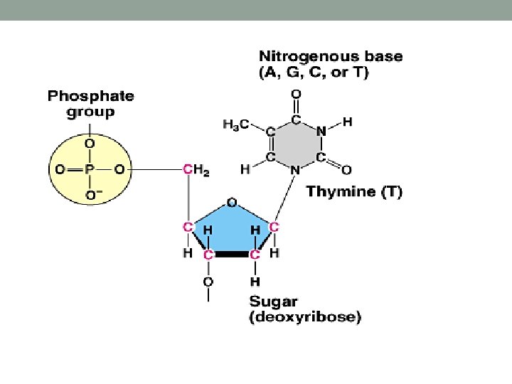 DNA has three components 1. 5 carbon sugar (deoxyribose) 2. Phosphate group (PO 4) 3. Nitrogenous base There are 4 nitrogenous bases in DNA: • • Adenine (A) Guanine (G) Thymine Cytosine (T) (C)