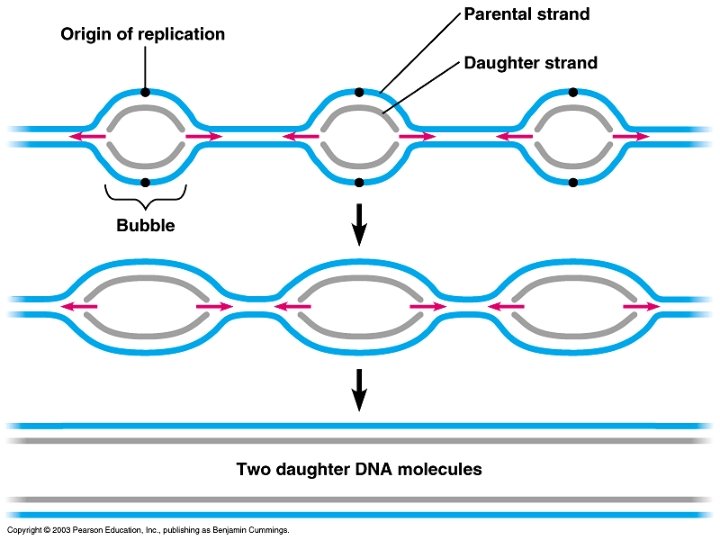 • Remember that this process is done for each of the two original DNA strands. • Think back to mitosis: when the chromosomes doubled • Replication does not actually begin at one end of the DNA strand end at the other. • To speed up the process, Replication begins at many points on the DNA strand that connect later. • These are called Replication bubbles.