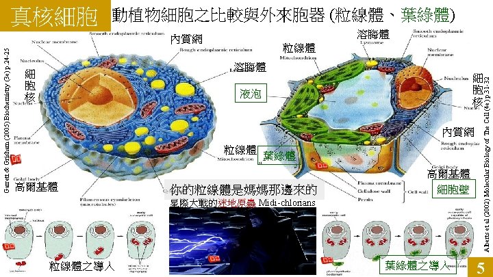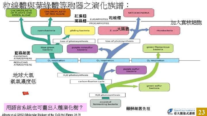 DNA 只有染色體 DNA 進入 粒線體呢? Alberts et al (2002) Molecular Biology of the Cell (4 e) Figure 14 -6 粒線體 纏在尾部的肌肉纖維 可有效提供運動能量 21