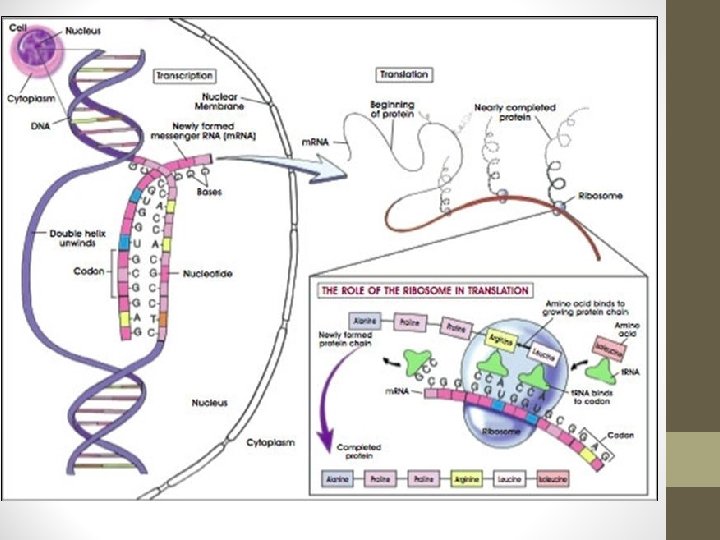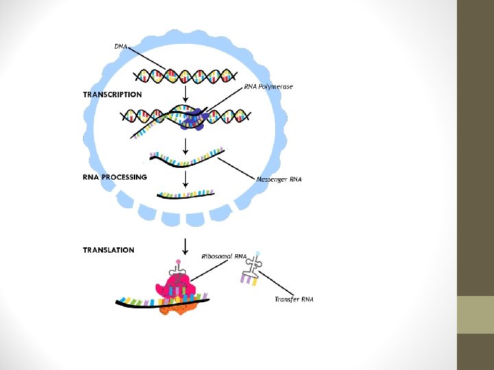 Transcription What does it do? Makes a single stranded RNA copy of the DNA called m. RNA. Where does it happen? Nucleus. Then the m. RNA exits the nucleus to the cytoplasm.