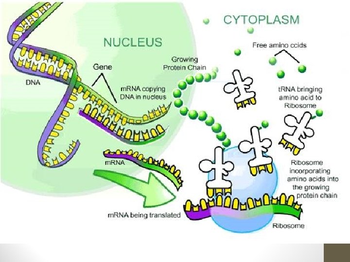 Translation (Protein Synthesis) What does it do? m. RNA and t. RNA work to translate the message from the DNA into a protein. Where does it happen? Cytoplasm. At ribosomes to be exact.