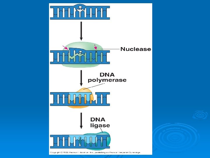 Excision Repair Ø Cuts out the damaged DNA. Ø DNA Polymerase fills in the excised area with new bases. Ø DNA Ligase seals the backbone.