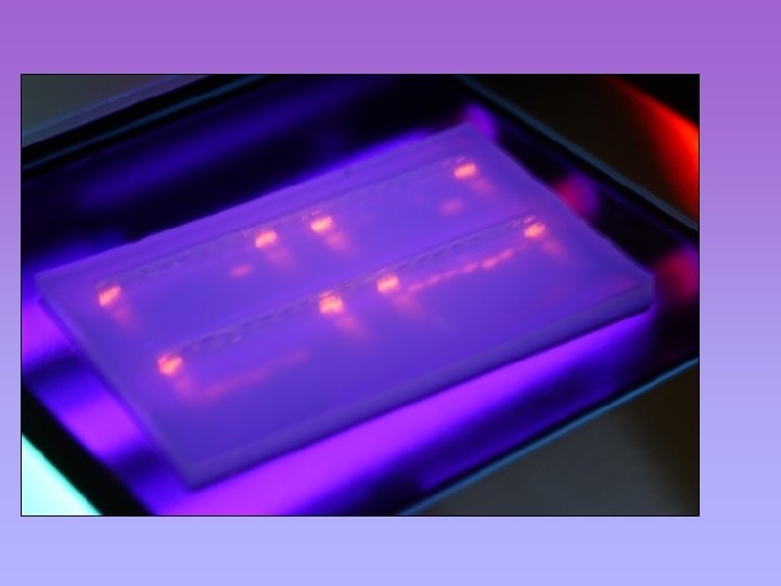 Gel electrophoresis § DNA moves in an electrical field… u so how does that help you compare DNA fragments? § size of DNA fragment affects how far it travels w small pieces travel farther w large pieces travel slower & lag behind DNA – “swimming through Jello” +