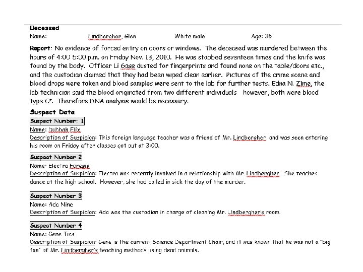 ANALYSIS: 1. On your chart, label the positive (+) and the negative (-) ends. READ THE INSTRUCTION PAGE THE ANSWER IS THERE!!!! Circle the suspects DNA that matches the CRIME SCENE DNA and write his name: REAL FATHER = For each of the following tasks performed in this “simulated” lab, describe what it is actually simulating. 2. Cutting the DNA into fragments with scissors: 3. Moving and taping the DNA onto the evidence sheet simulates what step in the actual process? What is: 4. A Polymerase Chain Reaction: 5. Gel Electrophoresis: 6. A Restriction Enzyme: