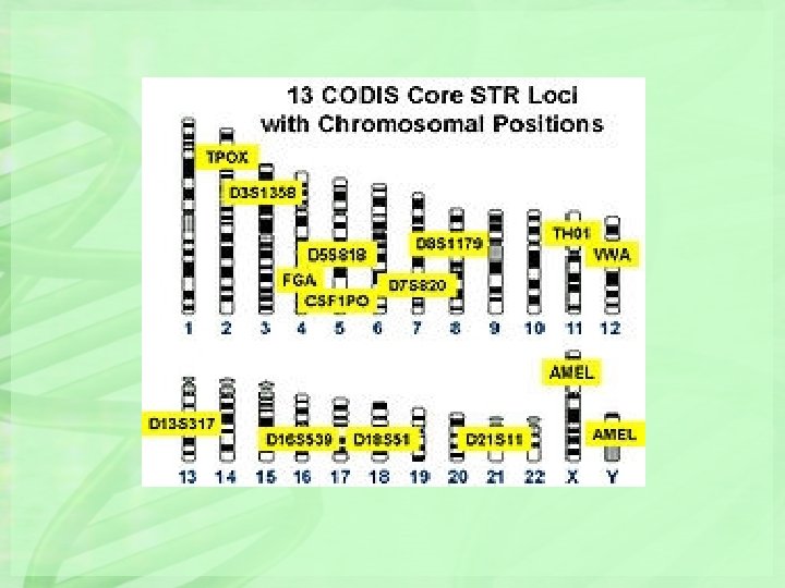 The 13 STR Loci in the Core CODIS Panel Locus 1. TPOX 2. D 3 S 1358 3. FGA 4. D 5 S 818 5. CSF 1 PO 6. D 7 S 820 7. D 8 S 1179 8. TH 01 9. VWA 10. D 13 S 317 11. D 16 S 539 12. D 18 S 51 13. D 21 S 11 Chromosome 2 3 4 5 5 7 8 11 12 13 16 18 21 Repeat Motif GAAT [TCTG][TCTA] CTTT AGAT TAGA GATA [TCTA][TCTG] TCAT [TCTG][TCTA] TATC GATA AGAA [TCTA][TCTG] Number of Alleles Observed 15 25 80 15 20 30 15 20 29 17 19 51 89