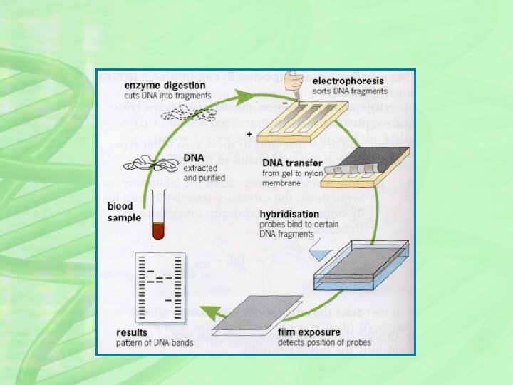HOW ITS DONE? ? 1. The DNA is cut up using restriction endonuclease, yielding thousands of fragments of different sizes. 2. Fragments are separated on the basis of size using a process called gel electrophoresis. 3. DNA fragments transferred from gel to filter paper or nylon membrane (This is called Southern blotting) 4. A radioactive material is added which combines with the DNA fragments to produce a fluorescent image. 5. A photographic copy of the DNA bands is obtained 6. The pattern of fragment distribution is then analysed